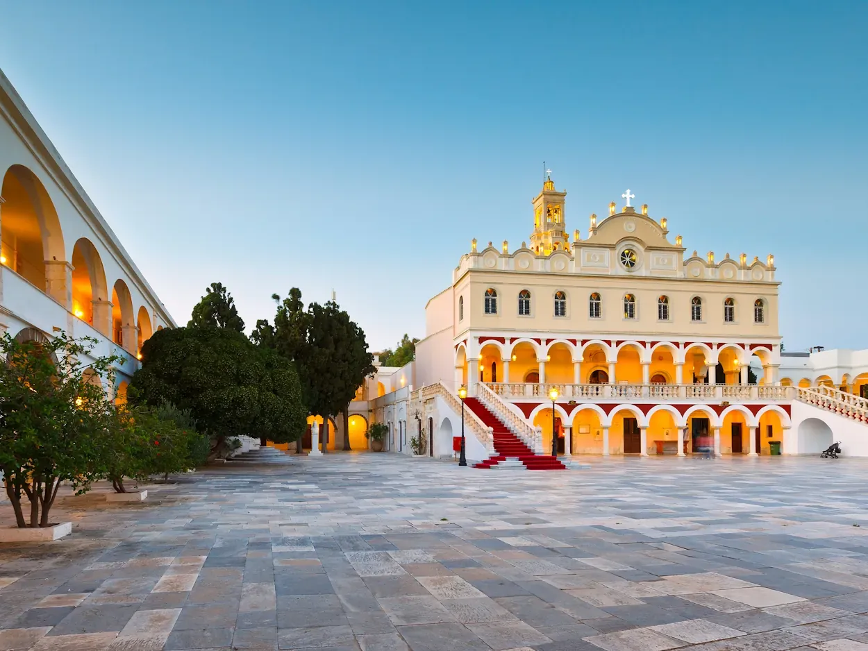 Το αποκορύφωμα του προσκυνήματός μας είναι η εκκλησία της Παναγίας Ευαγγελίστριας, ο πιο σεβαστός θρησκευτικός χώρος στην Ελλάδα. Αυτό το μεγαλοπρεπές ιερό, όπου φυλάσσεται η θαυματουργή εικόνα της Παναγίας, είναι ένας τόπος βαθιάς πίστης και αφοσίωσης, προσελκύοντας χιλιάδες προσκυνητές κάθε χρόνο.